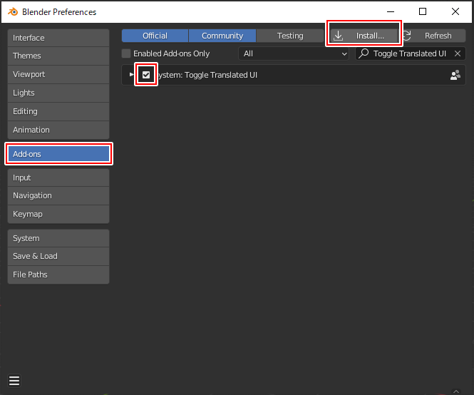 - Edit>PrefarenceよりAdd-onをInstallし有効化