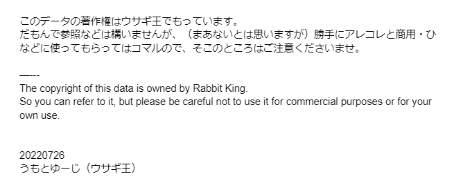 ちなデータの著作権は放棄してないのでソコんトコはヨロシクデゴザイマス。— umorimo (@umorimo) July 26, 2022