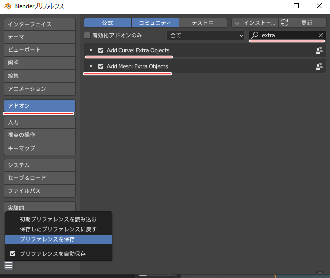Add Curve Extra ObjectsとAdd Mesh Extra Objectsを追加する。