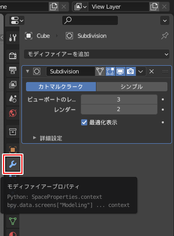 適用はモディファイアプロパティ>モディファイアを追加>サブディビジョンサーフェス