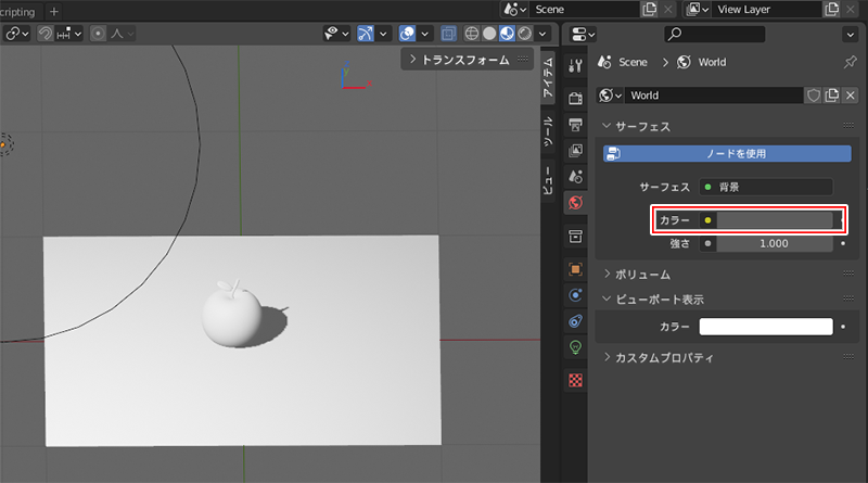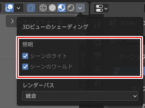 3DビューのシェーディングのシーンのライトとシーンのワールドのチェックをONにします