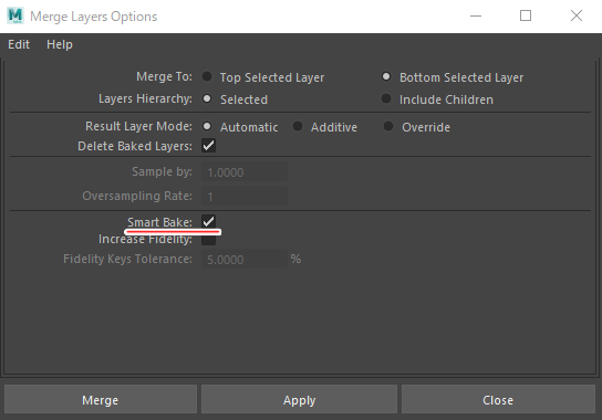 デフォルトの設定のままだとフルフレームでベイクされてしまうので、既存のキーを活かした形でマージされるように設定変更します