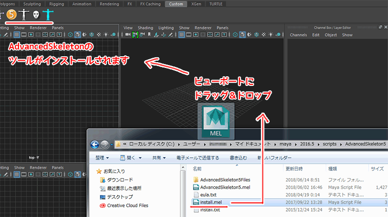 ※他ユーザーと共有したい場合にはネットワークドライブに置きます。 - Mayaを起動し、AdvancedSkeleton5フォルダ内にある「install.mel」をビューポートにドラッグ&ドロップ