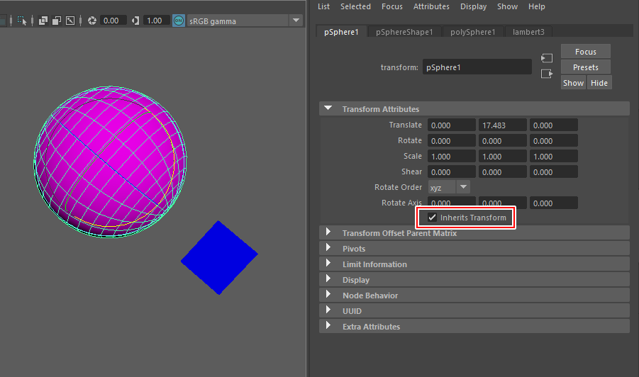 子オブジェクトのアトリビュートInherits Transformのチェックが外れていると、親のトランスフォームの値が継承されません。