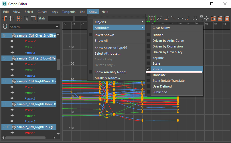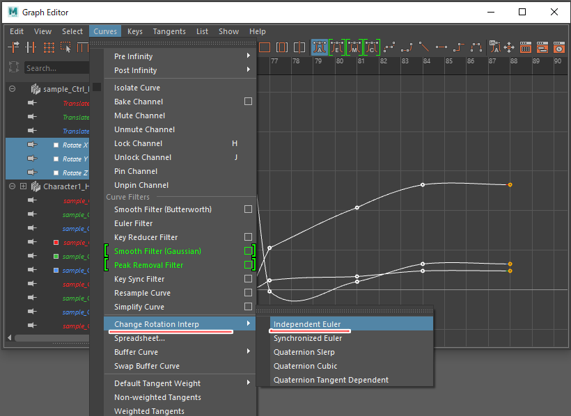 ■Curves>Change Rotation Interp>Independent Euler でオイラーカーブに変更することが出来ます