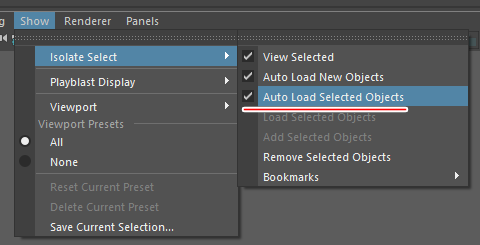 - 自動選択:Isolate Selectメニュー内の「Auto Load Selected Objects」を有効にすると、選択を変更するたびに自動で表示が更新されます。