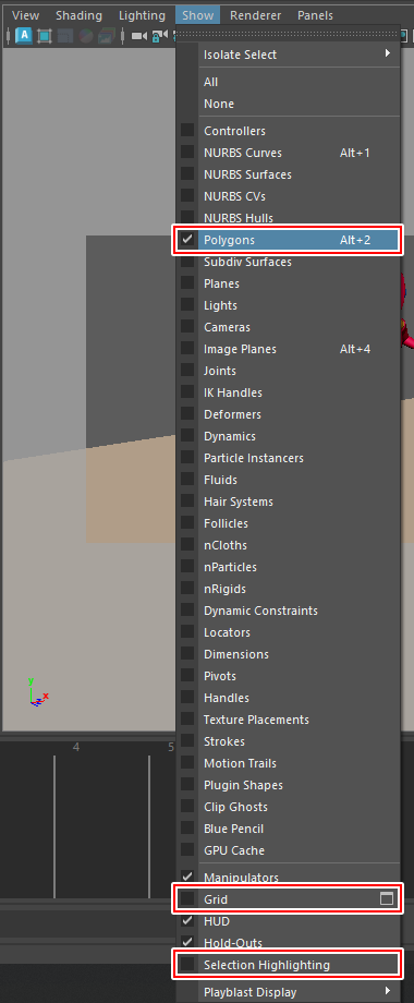 私の場合、全てを非表示にした後、Polygonsのみ表示(Alt+2)にし、Resolusion gateやグリッドもOFFにしています。