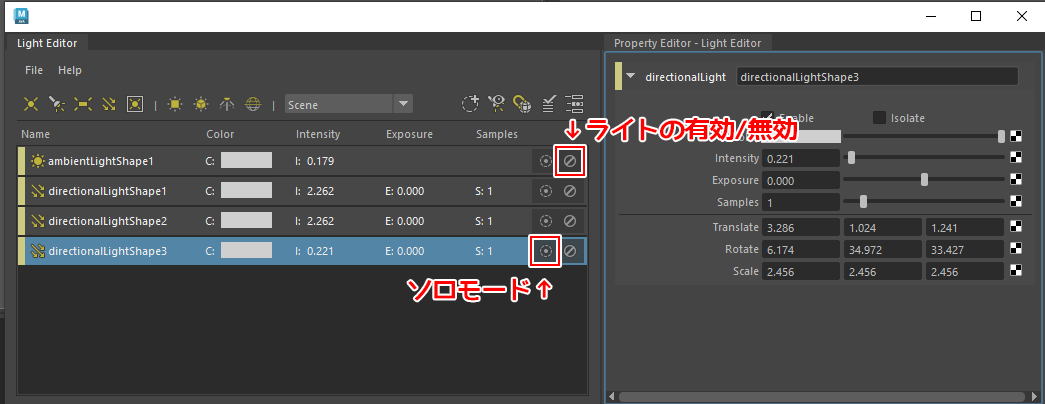 - さらに複製し、ディレクショナルライトと対称位置に配置して。フィルライトに