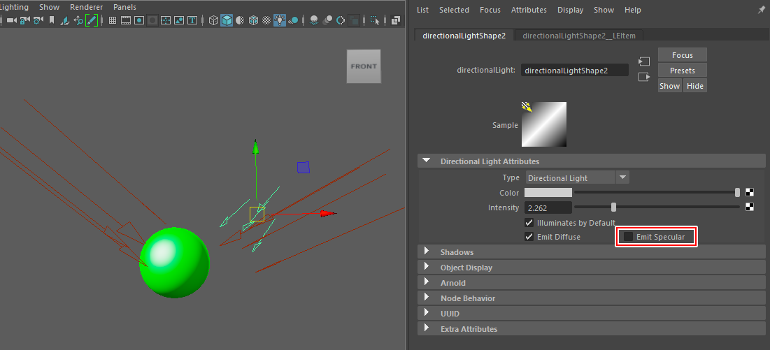 - 必要に応じてアトリビュートエディタより、バックライトとフィルライトのスペキュラへの影響をOFFに