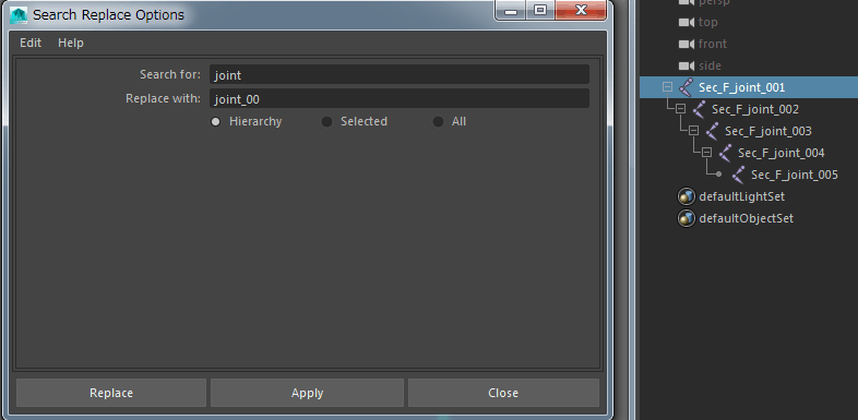 Mayaに特化したスクリプトを開発されているAriさんのCG自習部屋 Mayaの時間 で公開されているリネームスクリプトを使用するという方法もあります。