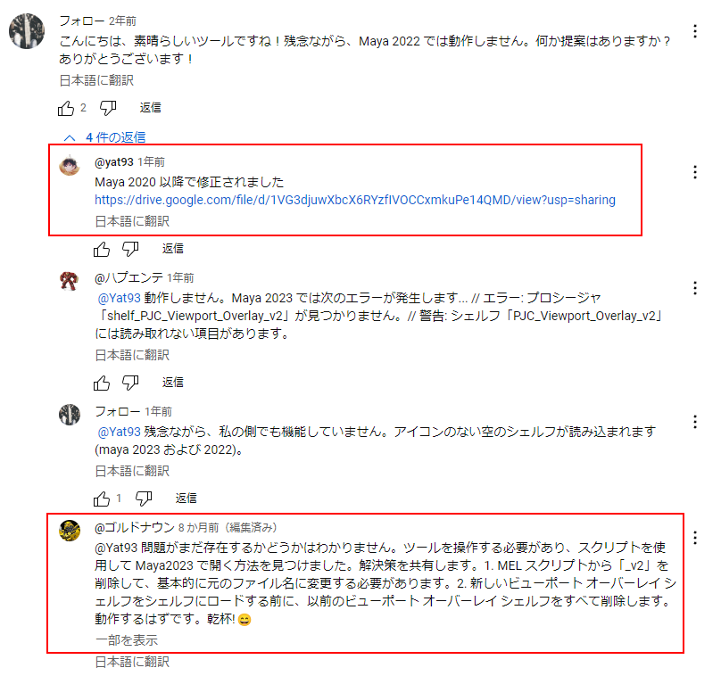動画のコメント欄を確認すると、修正Verも出ているようで赤枠の手順を実行することでMaya2023でも使えることを確認しました。