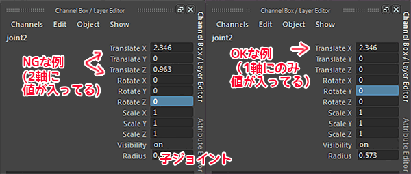 子階層のジョイントのTranslateは1軸のみが望ましいです。