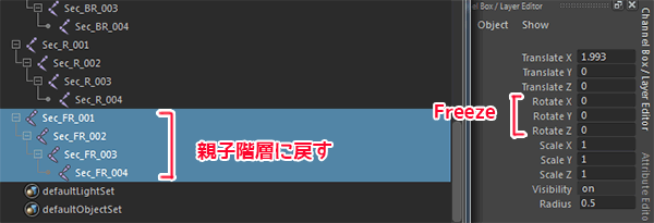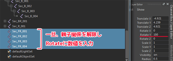 - Rotate:Zに180を入力、その後、Rotate:Zを選択したまま右クリック>Freez>ALL(またはRotate)で値をフリーズします。