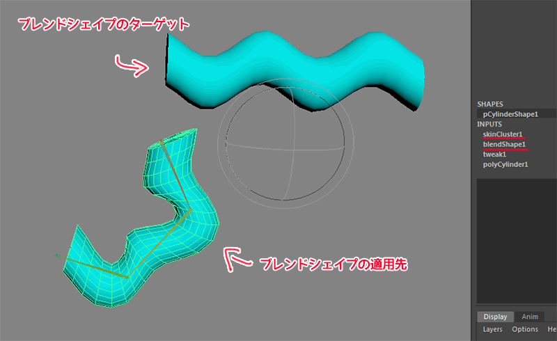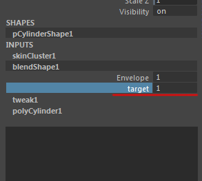 - 最後に選択したオブジェクトのアトリビュートを確認するとにBlendShapeノードが作成され、ターゲットオブジェクトの名前が登録されています。その値を1に変更することで変形が確認できます。
