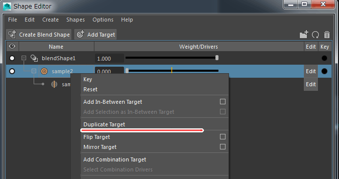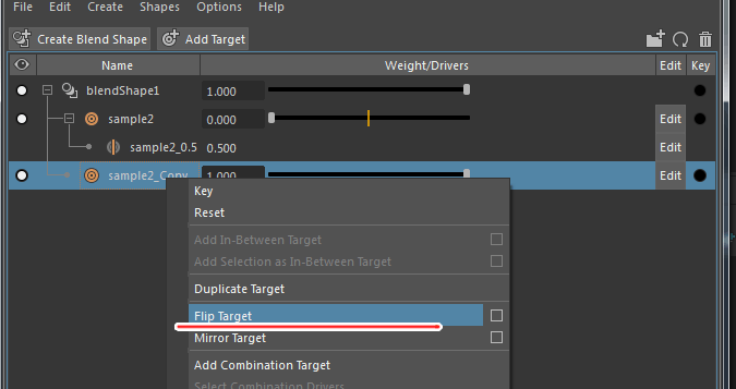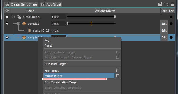 - ちなみに左右ターゲットを分けずに形状を反転させたい場合は、右クリック>Mirror Targetを選択します