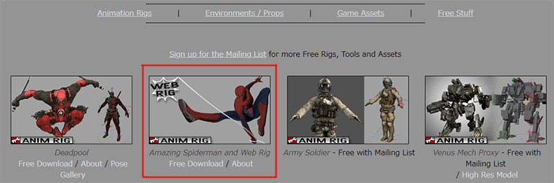 今回のサンプル作成にあたり、キャラクターアニメーター Kiel Figgins氏のAmazing Spiderman and Web Rigをお借りしました。