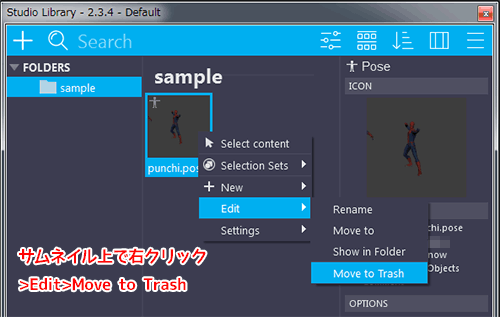 登録ポーズのサムネイルを右クリック>Edit>Move to Trash