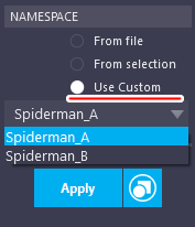 NAMESPACE >Use Customを選択(デフォルトではFrom selection)、プルダウンの中から適用したい先のネームスペースを選択し、サムネイルをダブルクリック又はApplyでポーズを適用します。