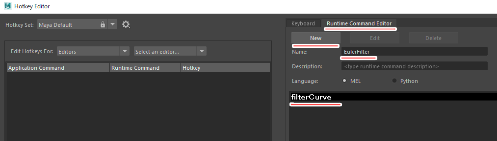 Hotokey Editor>Graph Editor>Runtime Command Editerタブ>Newを押して好きな名前を設定し、commandに