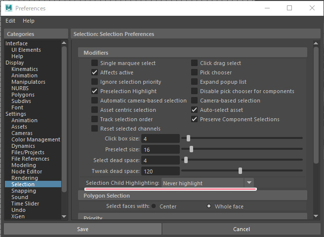 Prefarence>Selection>Selection Child Highlighting:Never hilightに変更