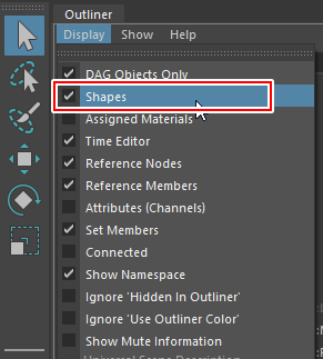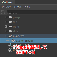 アウトライナーからShapesノードを表示、該当するオブジェクトのシェイプが非表示になっていないか確認する。