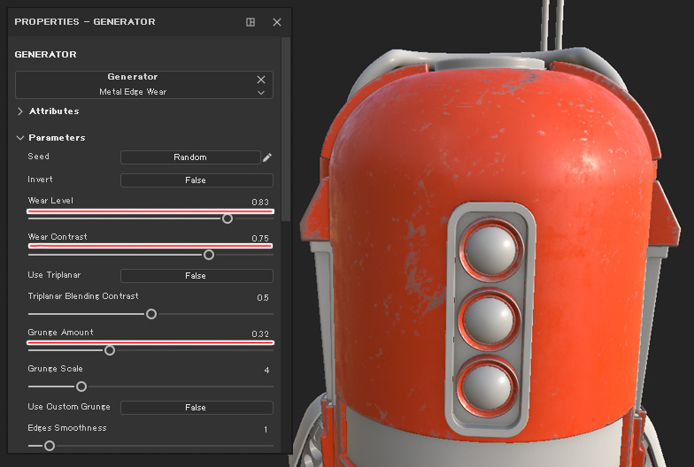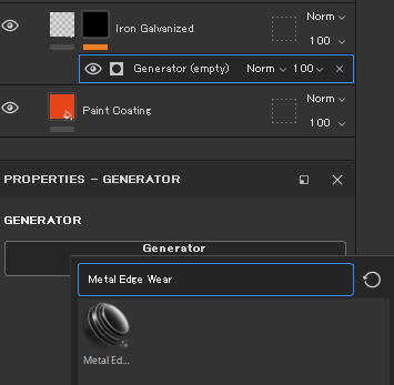 - Properties>Generator の空のスロットをクリックし、Metal Edge Wear ジェネレーターを選択します。