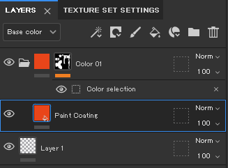 - BodyのTexture Setで、Color 01レイヤーグループを展開し、「Plastic Glossy Pure」レイヤーの名前を「Paint Coating」に変更します。