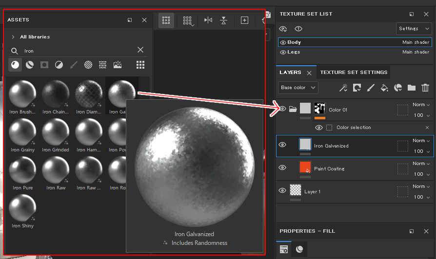 -  Shelf>Materialsで「Iron」を検索し、フィルタリングされた結果からIron GalvanizedマテリアルをColor 01フォルダにドラッグし、Paint Coatingレイヤーの上に置きます。これにより、LayerにFillレイヤーが追加されます。