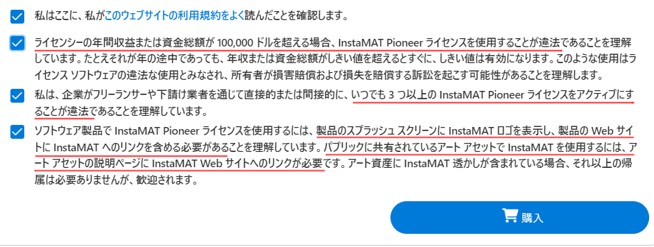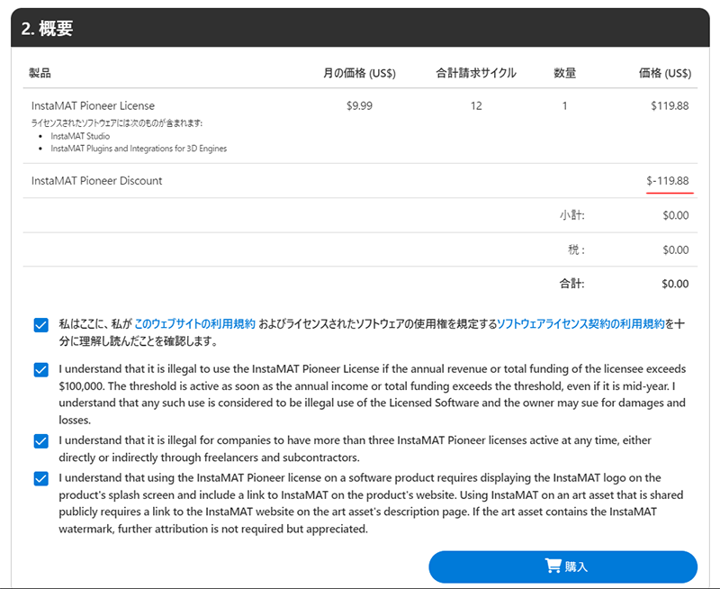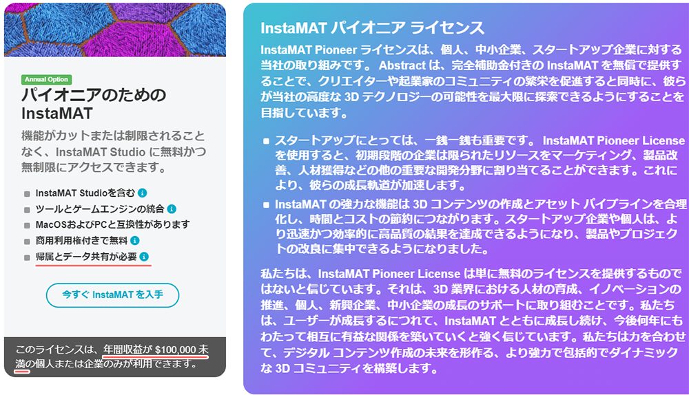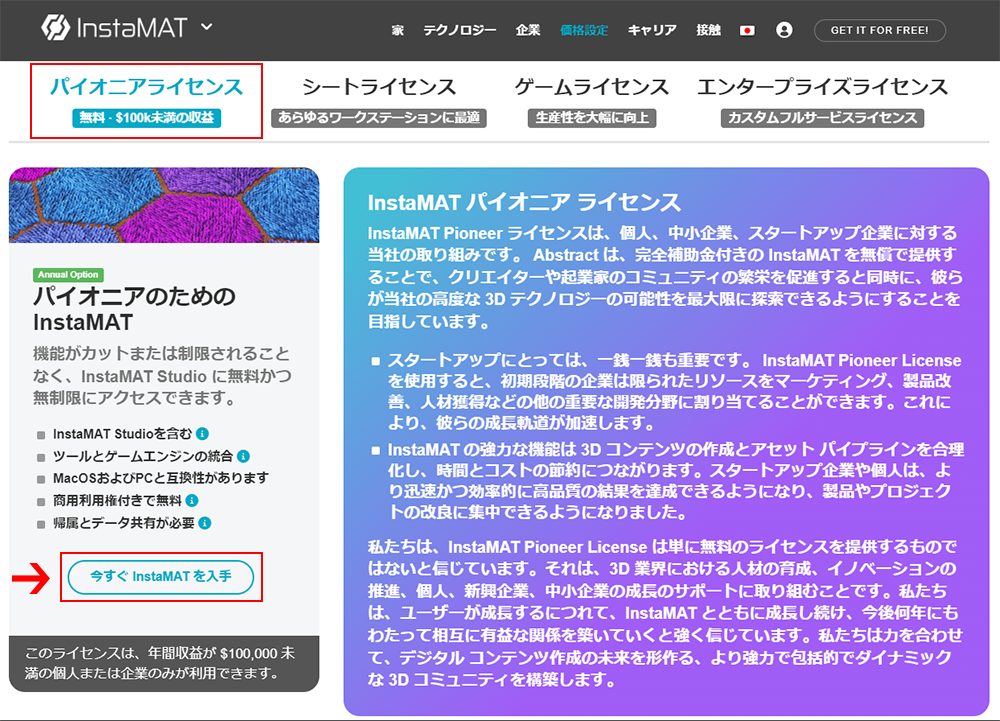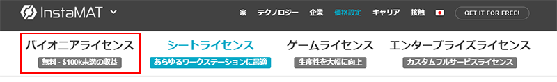 - ライセンスの選択画面が出てくるので、パイオニアライセンスを選択し、今すぐInstaMATを入手をクリックします。