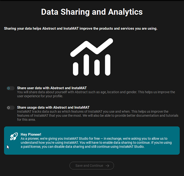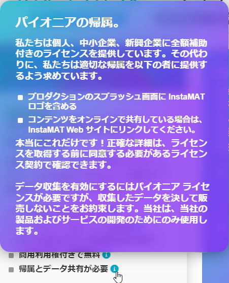 パイオニアとして、InstaMAT Studioを無料で提供します。その代わりに、InstaMATの使用状況を把握させてください。データ共有を有効にする必要があります。有料ライセンスをご利用の場合は、データ共有を無効にしても、InstaMAT Studio の使用を継続できます。ということで、無料で利用するためにはこの両方情報のシェアを許可する必要があります。