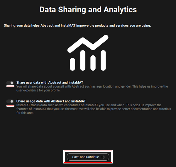 お客様は、年齢、場所、性別など、お客様ご自身に関するデータを Abstract と共有します。これは、お客様のプロフィールのユーザー体験の向上に役立ちます。Share usage data with Abstract and InstaMAT