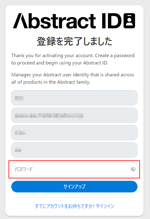 - Abstract IDの登録完了したのでそのまま、パスワードを登録します。