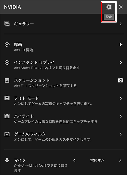 - まずはMayaなどを閉じてデスクトップ画面に戻り、キーボードでALT+Zを押します。すると、NVIDIAのオーバーレイメニューが画面全体に表示されるので、メニューの右上にある歯車マーク(設定)をクリックします。