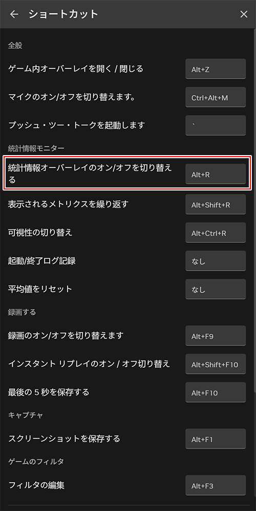 統計情報オーバーレイのオン/オフを切り替えるにALT+Rが設定されているのを確認できます。