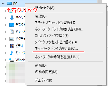 1. エクスプローラーのPC上を右クリックネットワークドライブの切断を選択します。