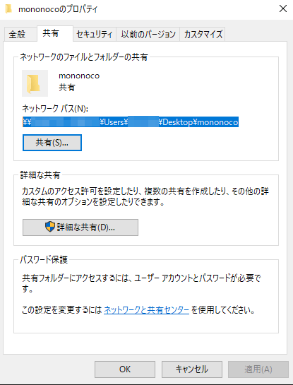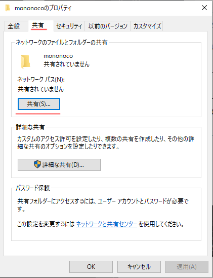 2. 共有タブのネットワークのファイルとフォルダーの共有から共有をクリックします