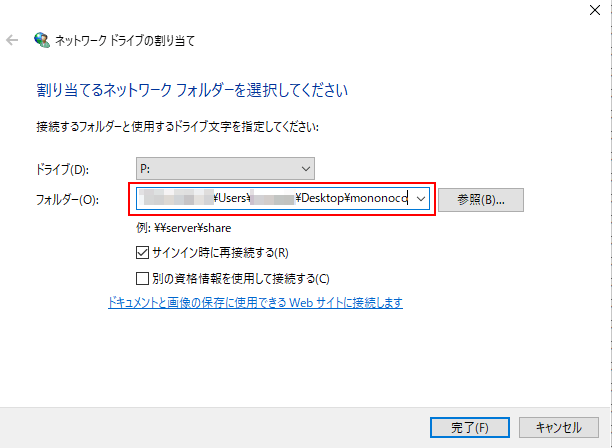 5. それをネットワークドライブの割り当てのフォルダにペースト、完了を押します