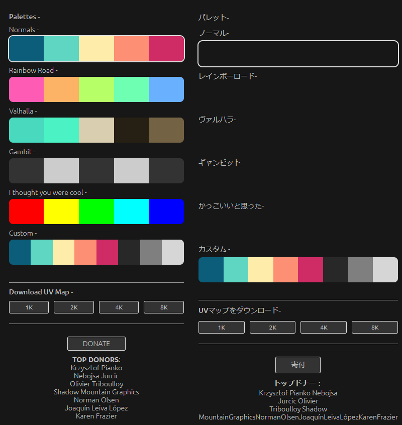 - 右側のUIで色を選んで、気に入ったものが出来たらDownload UV Map からダウンロードします。