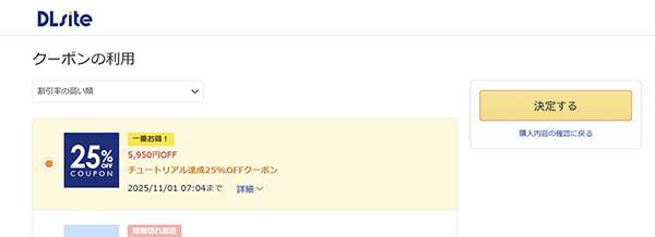 とはいえ、少しでも安く在りたい…とたどり着いた結果、DLsiteチュートリアルで25%OFFクーポンをゲットする。