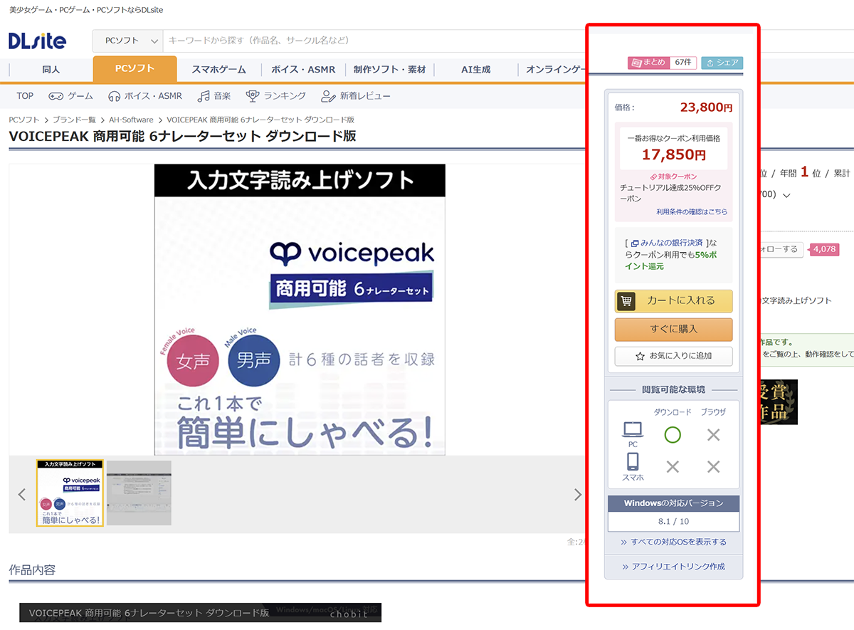 今回ご紹介する方法でVOICEPEAK 商用可能 6ナレーターセット ダウンロード版を23,800円→17,850円とお安く購入することが出来した。なんと定価から約6,000円引き✨