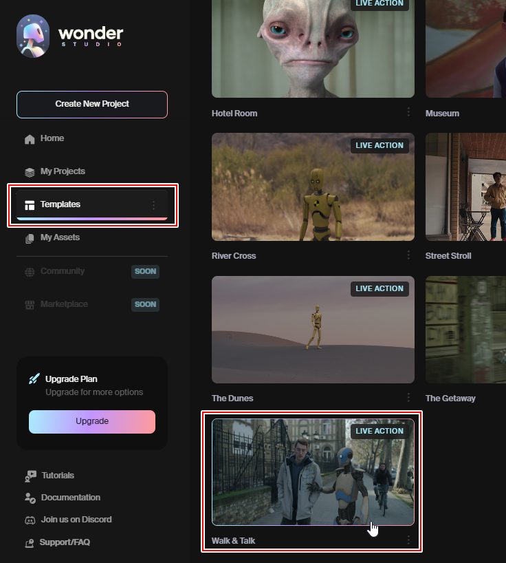 Templateメニューにアクセスすると一覧で確認できるのでおすすめです。今回はWalk&Talkを選択しました