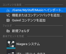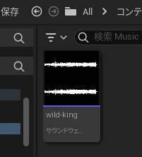 - コンテンツブラウザにMusicフォルダを作成し、音楽ファイル(wav)をインポートします