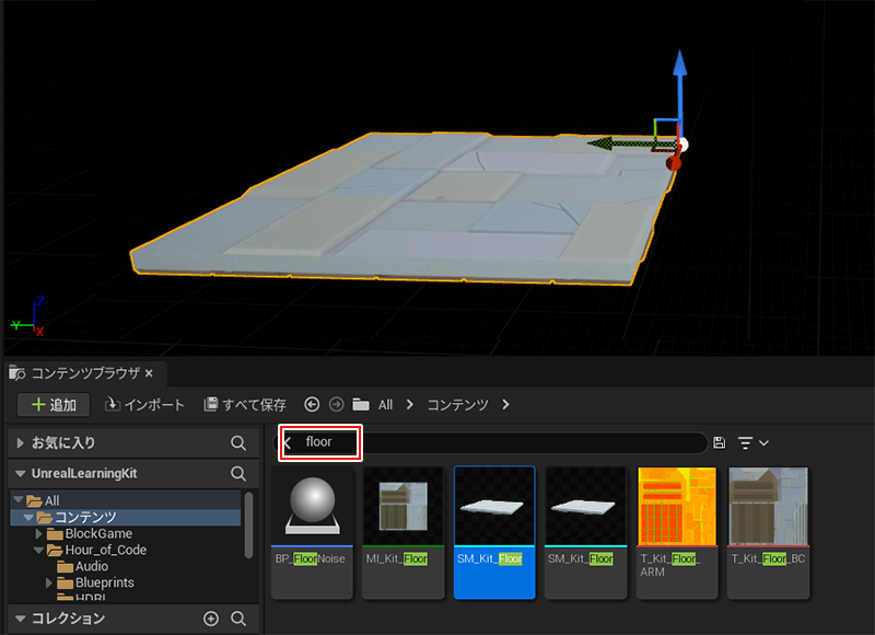 コンテンツブラウザでFloorと検索し、スタティックメッシュ(SM_Kit_Floor)を配置します。