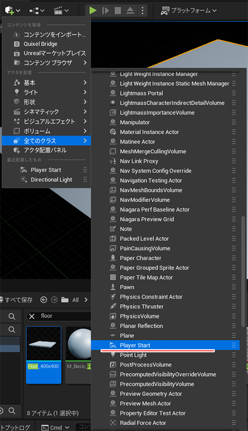 キューブに+アイコンから全てのクラス>Player Start を選択、中央付近に配置します。