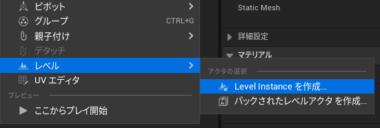 - レベルインスタンス化したいアクターを選択し、右クリック>レベル>Level Instanceを作成