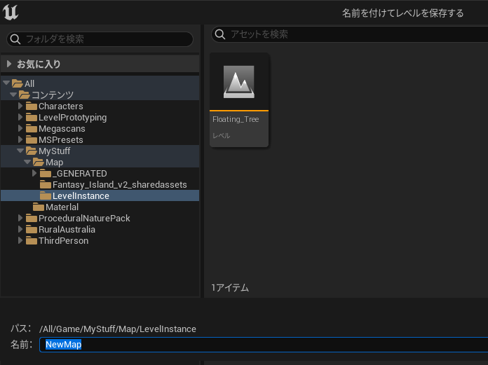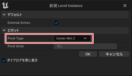 ・Pivot Actor (Pivot アクタ):アクタをピボットとして選択した場合、ドロップダウンで、レベルインスタンスのピボットポイントになるアクタを選択します。 - レベルの保存先とファイル名を指定します