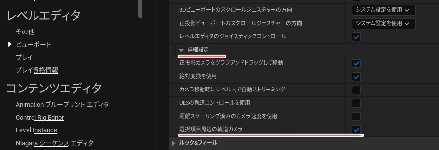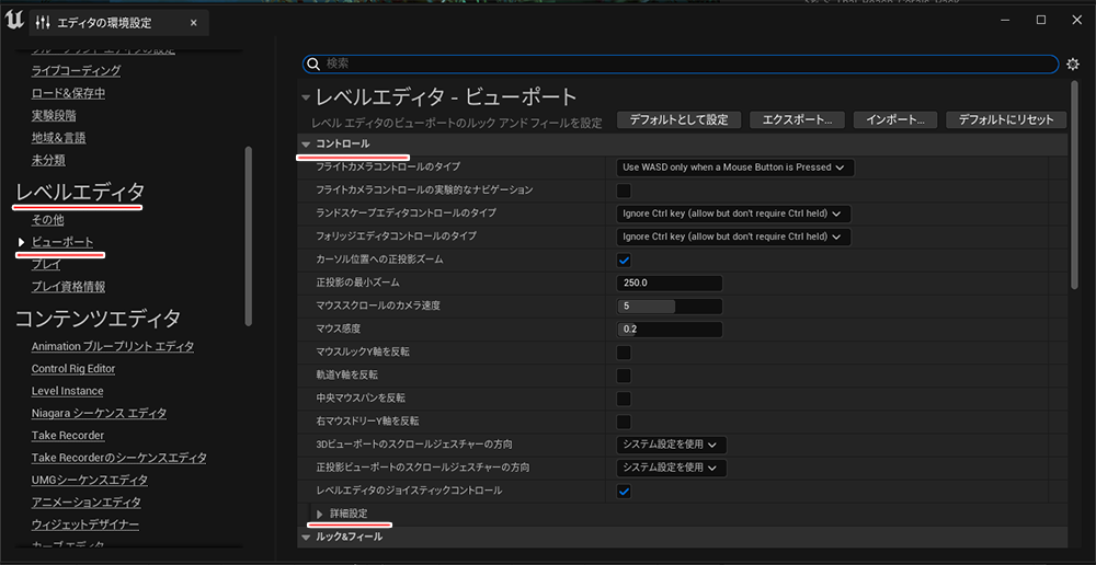 - レベルエディタ>ビューポート>コントロール>詳細設定を開きます。