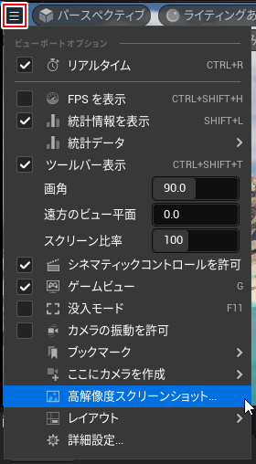 UI左上のハンバーガーメニュー>高解像度スクリーンショット