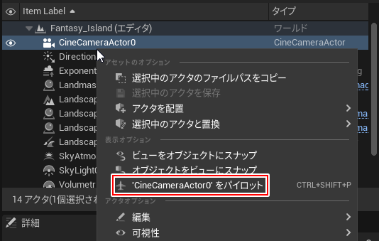 カメラアクタを選択し、右クリック>(アクタ名)をパイロット(CTRL+SHIFT+P)