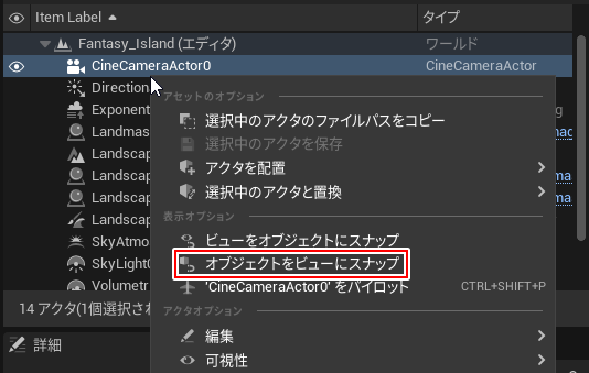 カメラアクタを選択し、右クリック>オブジェクトをビューにスナップ
